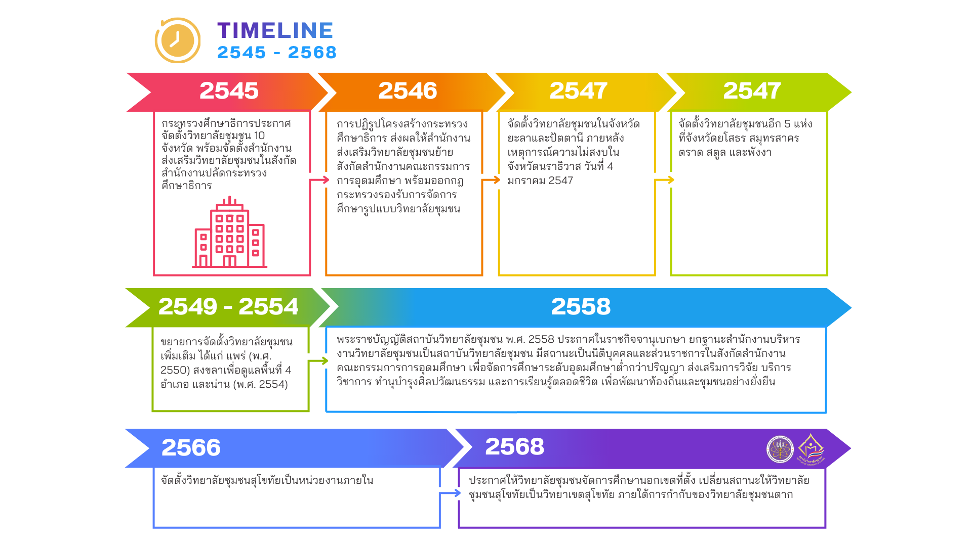 19 ก.พ. 2545 คณะรัฐมนตรี มีมติเห็นชอบโครงการจัดตั้งวิทยาลัยชุมชน กระทรวงศึกษาธิการมีประกาศจัดตั้งวิทยาลัยชุมชน เมื่อวันที่ 17 เมษายน พ.ศ. 2545 จำนวน 10 จังหวัด คือ จังหวัดแม่ฮ่องสอน พิจิตร ตาก บุรีรัมย์ มุกดาหาร หนองบัวลำภู สระแก้ว อุทัยธานี ระนอง และนราธิวาส และได้จัดตั้งสำนักงานส่งเสริมวิทยาลัยชุมชน ในสังกัดสำนักงานปลัด กระทรวงการศึกษาธิการน